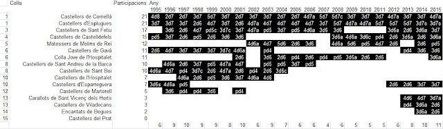 Tornava a cuidar-me de Trúitert, que sembla que està a punt de desaparèixer --un maldecap menys, suposo--, i el Rai em deia que som l'única colla de l'univers que anunciem a començament d'actuació els castells que farem --segons connexions ultrasecretes amb els que porten les retransmissions de La Xarxa. Doncs res, sortíem de 5de7, el sisè de l'any, un castell que s'havia dit que era com el castell insígnia de la colla o una cosa per l'estil, perquè quan en fèiem molts era perquè teníem moltes camises; també va ser el castell que va escenificar el canvi de relleu a la comarca: en la Trobada del Baix del 2008 el vem descarregar i Cornellà no, el punt d'inflexió en què nosaltres ens vem posar per davant seu i vem començar a assolir tota la gamma de set fins als castells de vuit alguns anys més tard.
